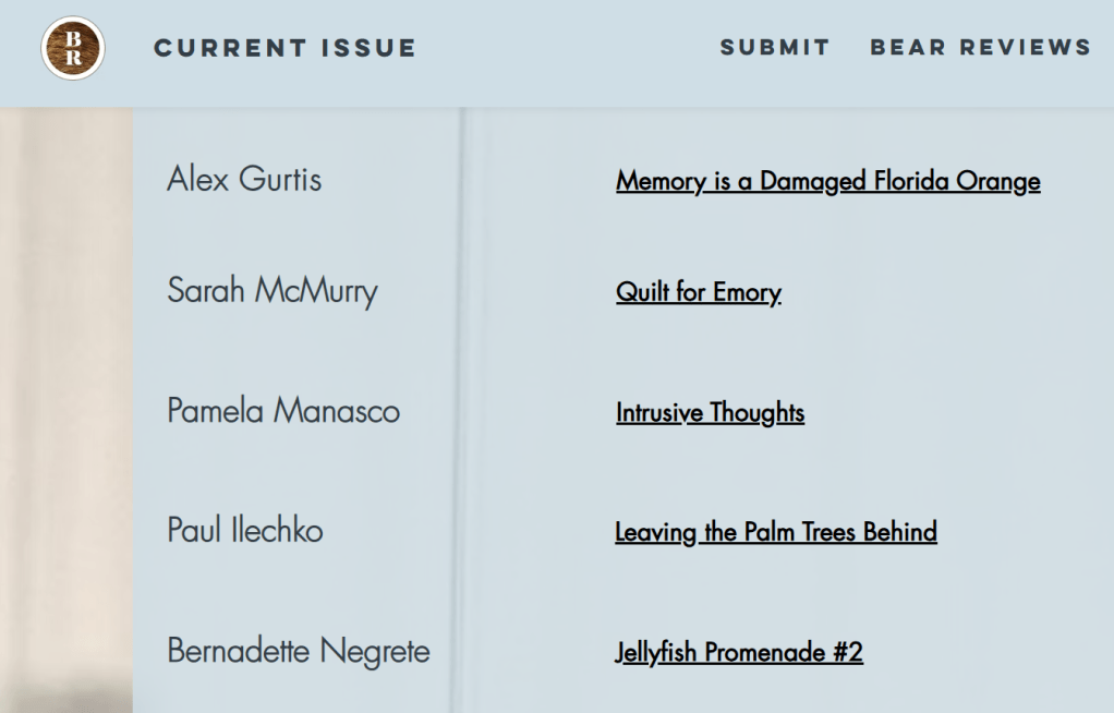 So this is a very belated thank you to Bear Review for publishing my poem “Intrusive Thoughts.” Please check it out in their newest edition here!